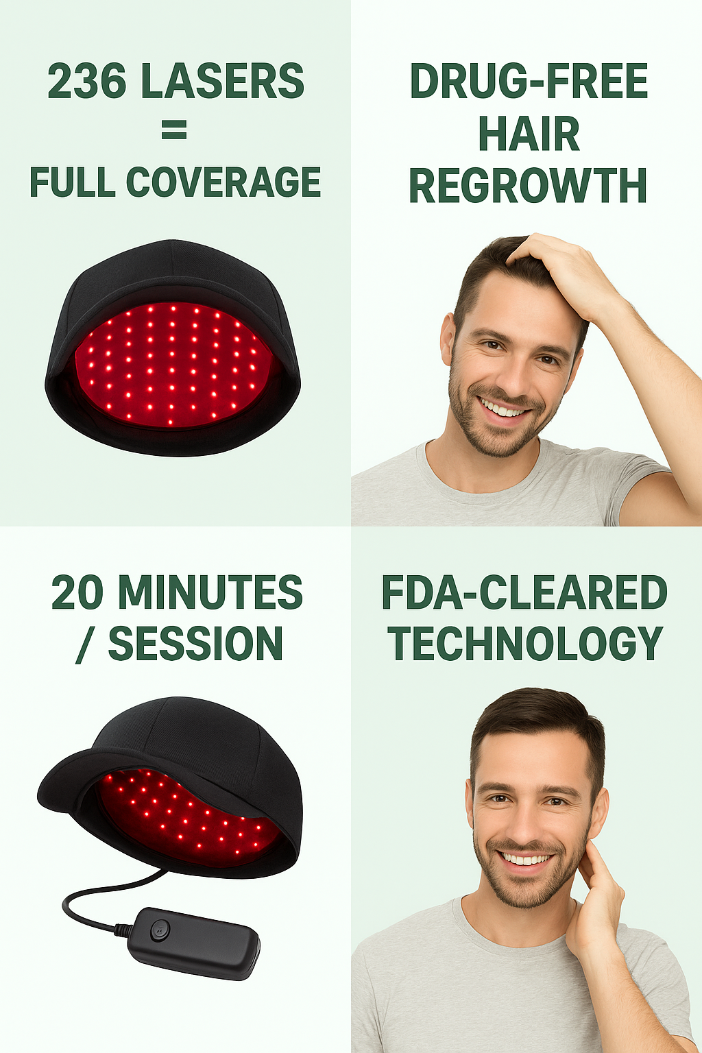 - Drug-free & FDA-cleared LLLT for safe, effective hair regrowth