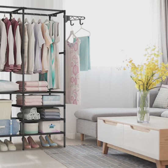 Optimize your storage with the Clothes Rack Double Row Clothes Rack Large Floor Hangers With Hanging Hooks Shoes Household Storage Shelf Modern Coat Rack. Built with anti-corrosion steel and pp plastic connectors, this coat rack is both sturdy and stylish. It offers a practical solution for organizing your clothes, hats, and shoes, making it an essential addition to any home.