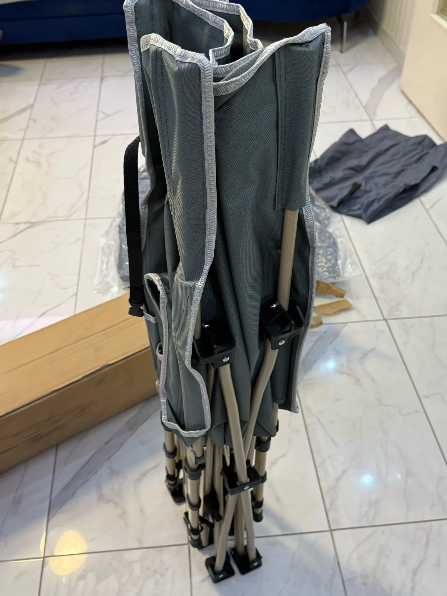 Strong Bed.mattress unless not think enough go's flat after 1s sleep plus you can feel the bars on the sides bag on the side was missing would not recommend this camp bed